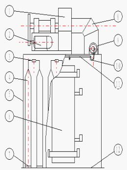 (3)搖動機構(gòu)包括:⑨搖動用減速電機⑩曲桿,搖動連桿③搖動軸(或稱濾袋懸掛軸);