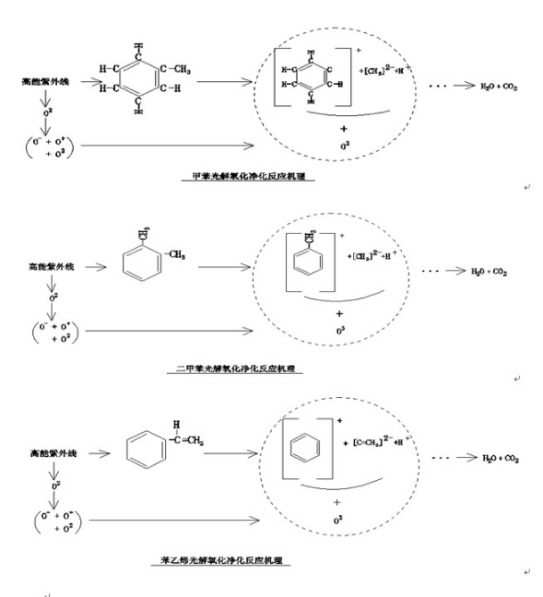 研究表明:活性自由基·OH 的氧化電位(2.8eV)比氧化性_的臭氧的氧化電位(2.07eV)還高出35%。·OH 自由基與有機(jī)物的反應(yīng)速度高出幾個(gè)數(shù)量級(jí)。而且·OH自由基對氧化污染物的反應(yīng)是無選擇性的,可引發(fā)鏈?zhǔn)椒磻?yīng),直接將污染空氣中的大部分有害物質(zhì)氧化為二氧化碳和水或礦物質(zhì)。其作用機(jī)理如下: